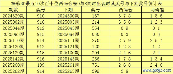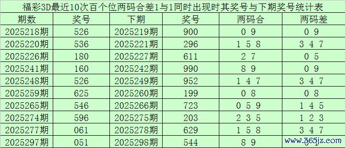 百个位合差分析:上期奖号百个位开出10组合,两码合为1,两码差为1,青青爽精品视频在线观看最近10次百个位两码合1与两码差1同期出刻下,其奖号和下期奖号离别为: